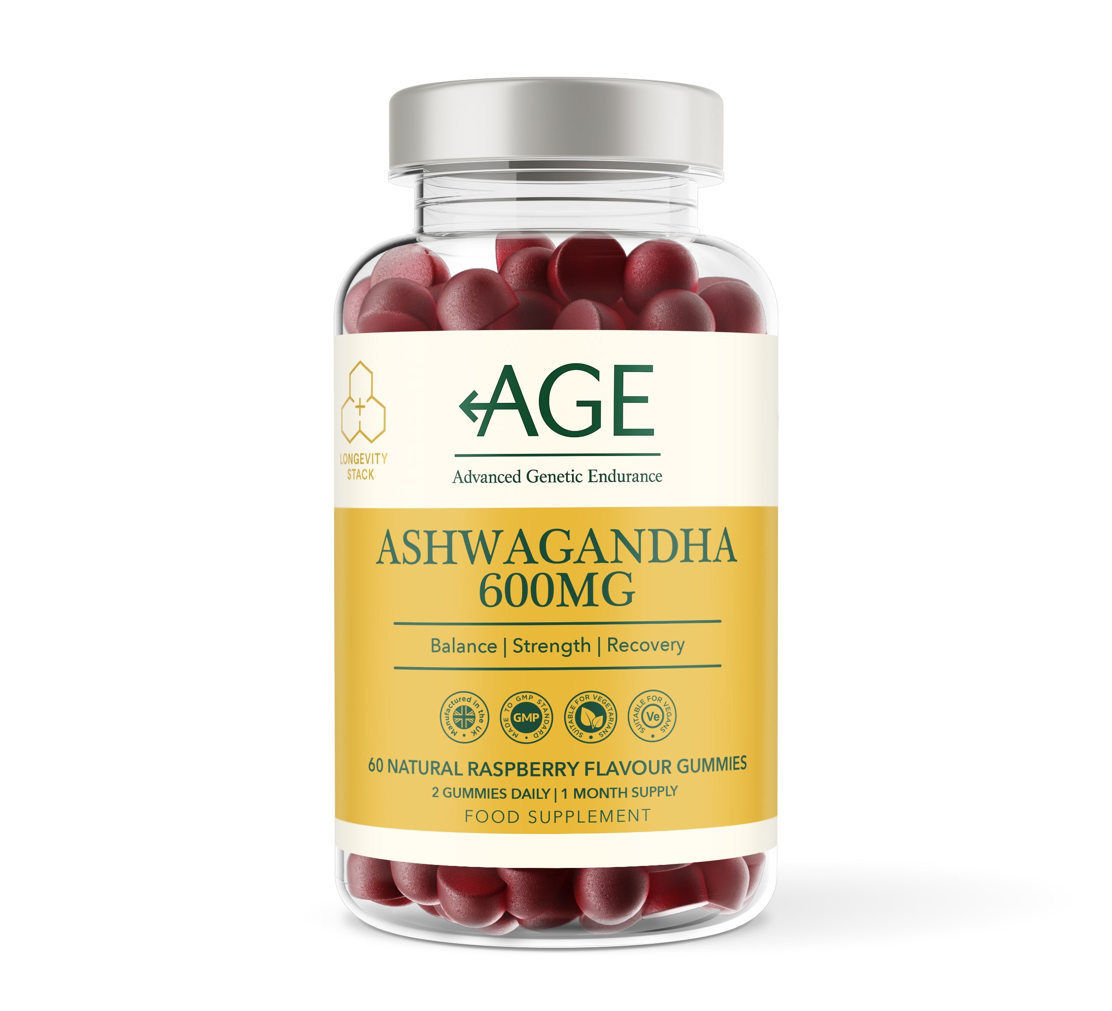 Glucose Syrup, Sugar, Water, Pectin (Gelling Agent), Citric Acid (Acid), Ashwagandha Root Extract (Withania somnifera), Maltodextrin, Trisodium Citrate (Acidity Regulator), Coconut Oil (Oil coating), Anthocyanins (Natural colouring), Magnesium Citrate, Natural Raspberry Flavouring, Carnauba Wax (Anti-Caking Agent).